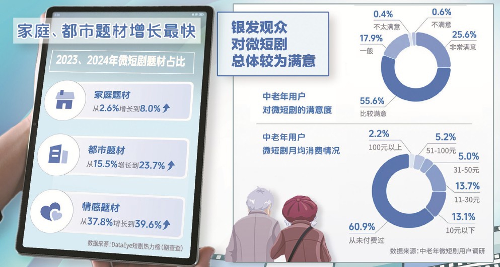 2024年,由于银发微短剧的意外火爆,再次让全社会关注到老年人的精神生活。报告显示,微短剧在中老年群体中有着广泛的受众基础。超过八成受访的中老年微短剧用户表示,他们每周至少看一次微短剧,且更喜欢看免费剧。与此同时,外界对老年人观看微短剧的态度也在发生悄然转变,越来越多的人意识到,一味指责老年人“沉迷”微短剧可能出于某种家庭代际间的误解。部分老年人确有“孤独感”和“脱节感”,而他们热衷网络社交是为了寻求“归属感”,热播剧集也给他们提供了一定的“情绪价值”。中国人民大学新闻学院视听传播系副主任何天平认为,从短剧中能看到中老年文化消费需求,“沉迷”或许是个伪命题,应引导银发一族更积极参与数字生活。